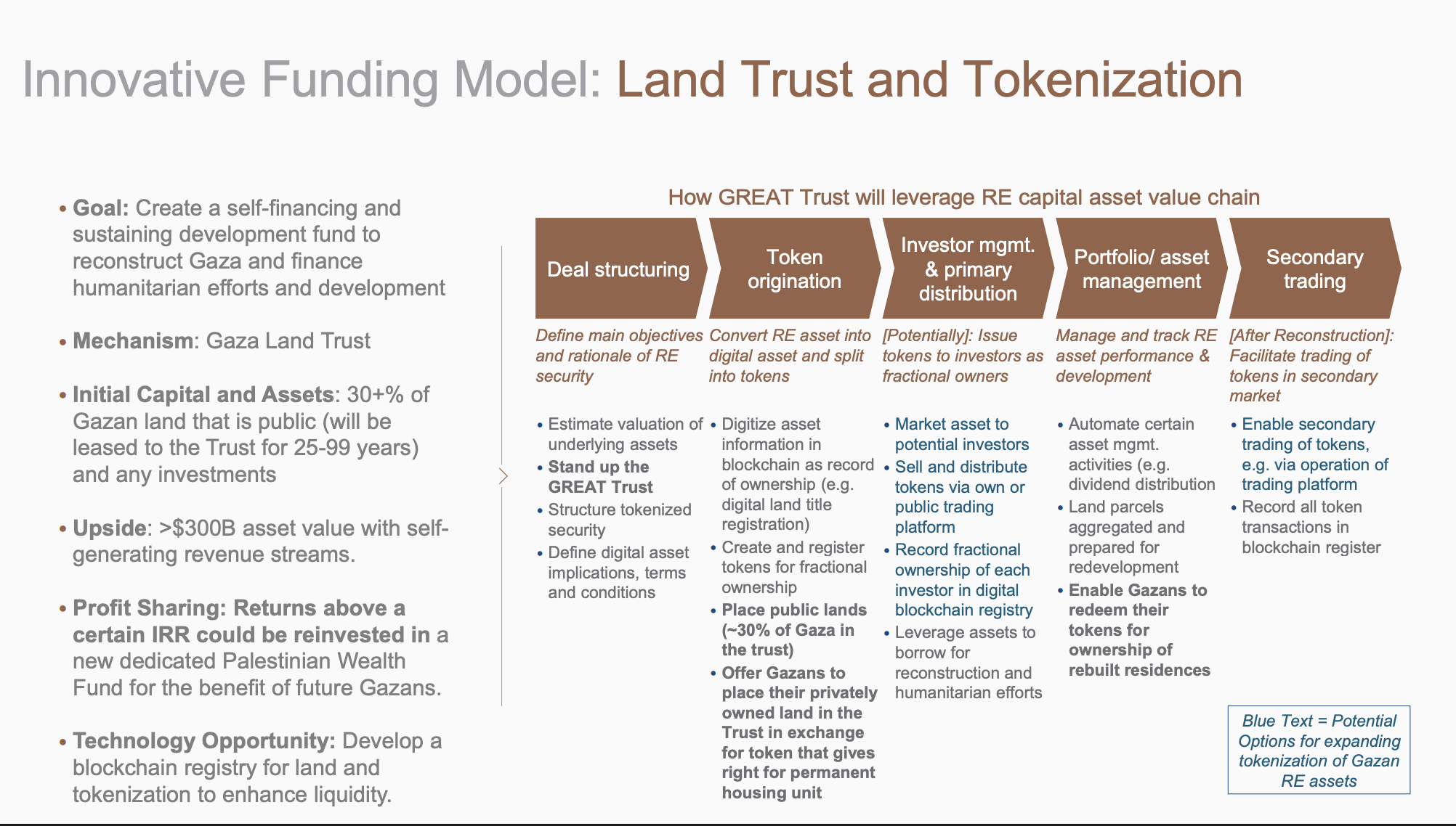 Page nine describes something called “land tokenization.” They want to convert Palestinian land into blockchain tokens. Public lands (thirty percent of Gaza) would go into a trust controlled by the reconstruction authority. Private landowners would be offered the opportunity to place their land in the trust in exchange for tokens that grant rights to eventual housing. Except the housing doesn’t exist yet, and the tokens are controlled by a system Palestinians don’t govern.
