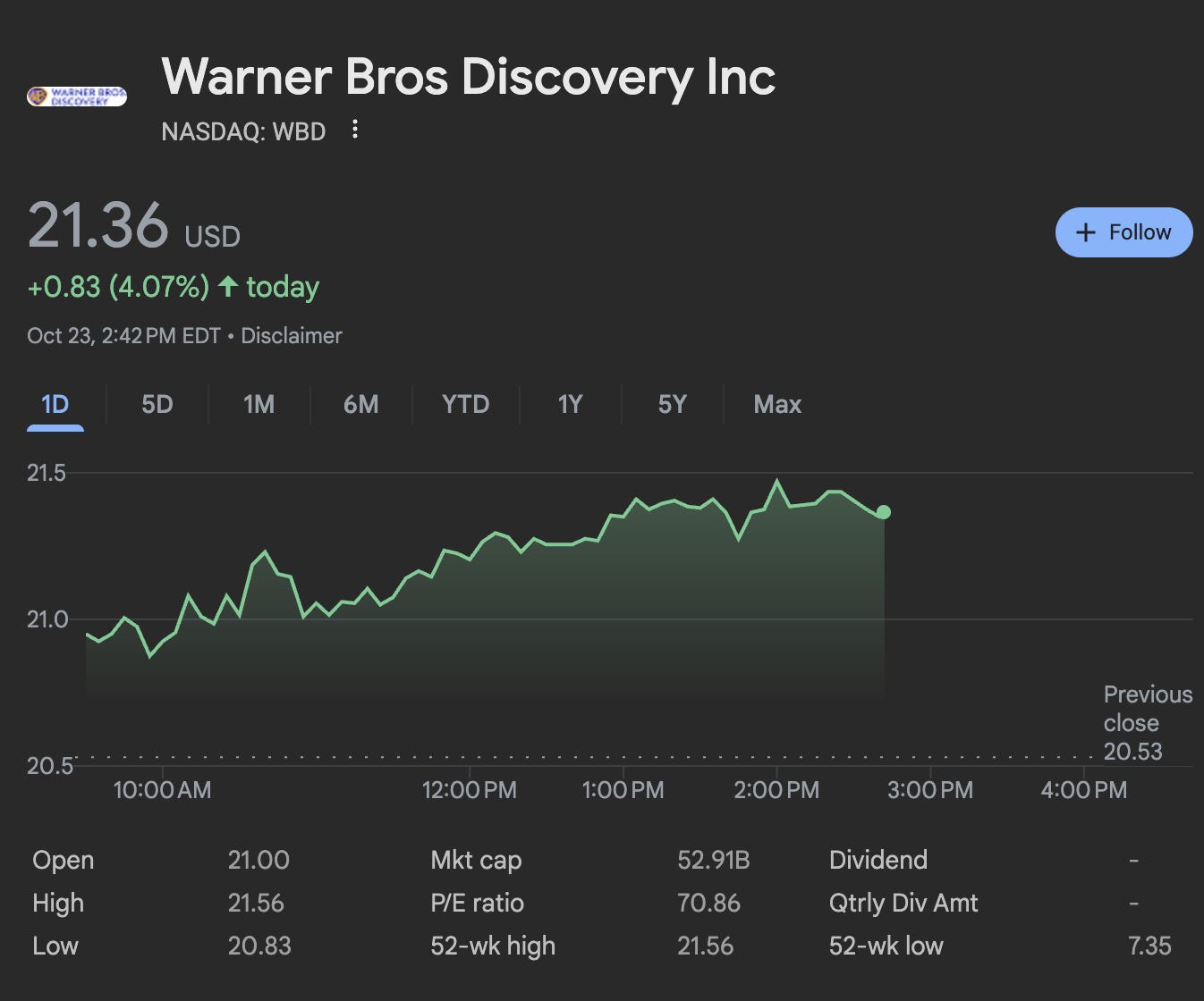 MacroTrends: Warner Bros Discovery - 20 Year Stock Price History (October 21, 2025)