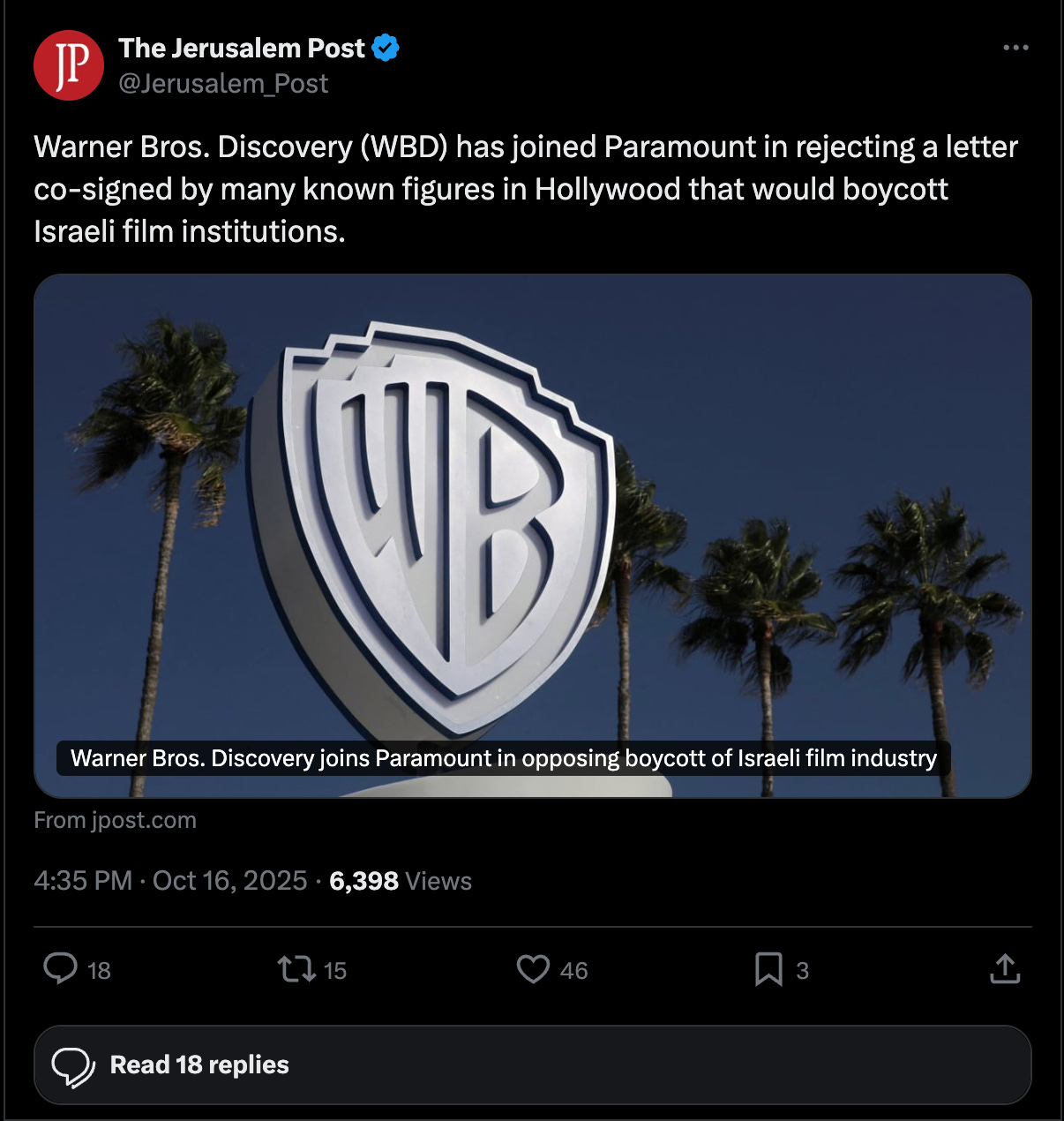 Deadline: Warner Bros Discovery Follows Paramount In Rejecting Israeli Film Industry Boycott (October 16, 2025)