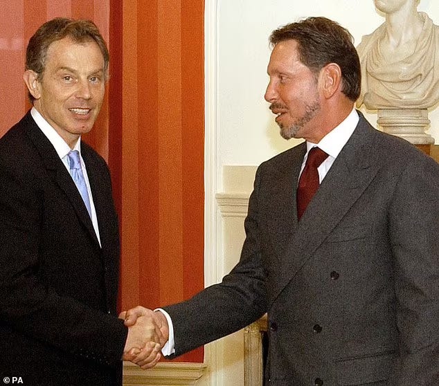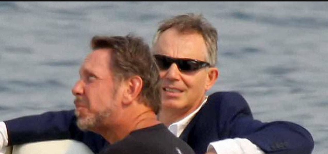 I keep returning to this image: Tony Blair on a yacht off Sardinia in 2009, his political career over, Iraq having destroyed him, called a war criminal, a liar, a poodle, disgraced and diminished. And yet there he is, looking relaxed, looking comfortable, looking like a man whose fortunes have not actually declined at all. The yacht belongs to Larry Ellison. The political project had failed, but the infrastructure remained and the friendship endured, and Tony Blair, it turns out, had nowhere to go but the future.