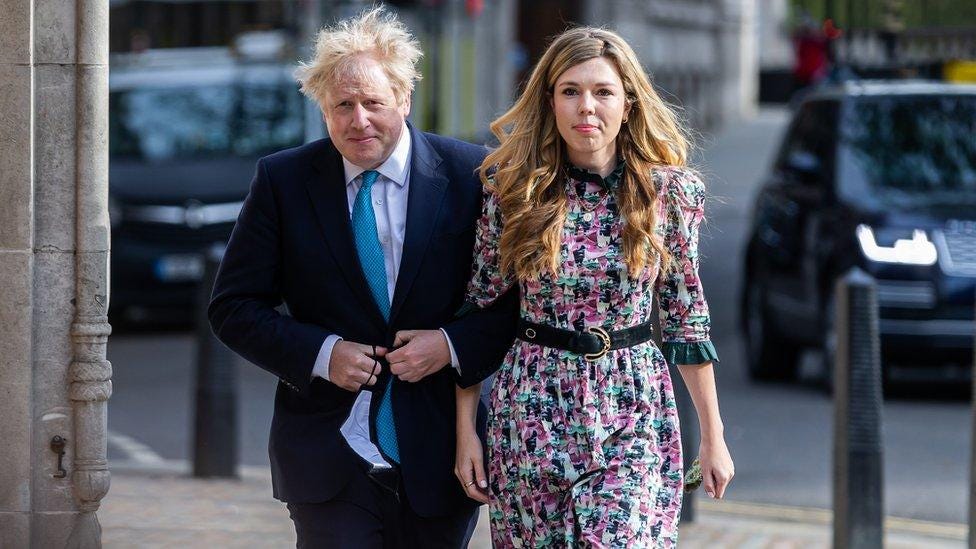 Matthew Symonds also has a daughter named Carrie, and while that name might not mean anything on its own, Carrie Johnson, wife of Prime Minister Boris Johnson, certainly does. In 2018, when Ellison hired her father, Carrie was not yet Boris’s wife; Boris was married to someone else, and Carrie was his mistress. So to be clear about what was happening: Larry Ellison hired the father of the woman who was, at that moment, having a secret affair with Boris Johnson. In 2019, the affair went public, the tabloids exploded, Boris got a divorce, and during all of this Ellison moved his foundation headquarters to London. Boris became Prime Minister, Carrie moved into Downing Street, and in February 2020 they announced their engagement.