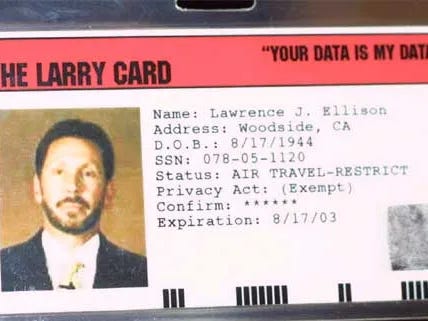 Ellison went on the radio and pitched it: national ID cards for every American, biometrics, fingerprints, iris scans, facial recognition, one big database, and Oracle would provide the software free of charge. How generous and civic-minded, what a gift to a grieving nation.