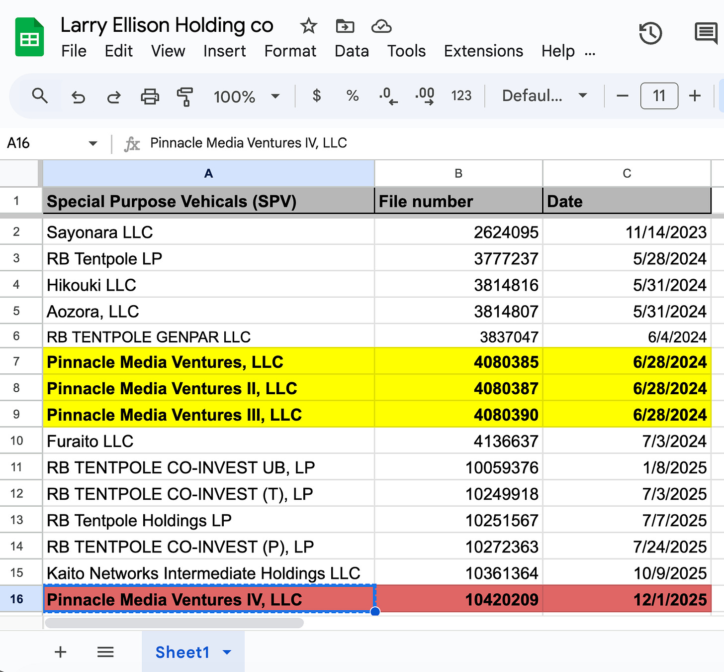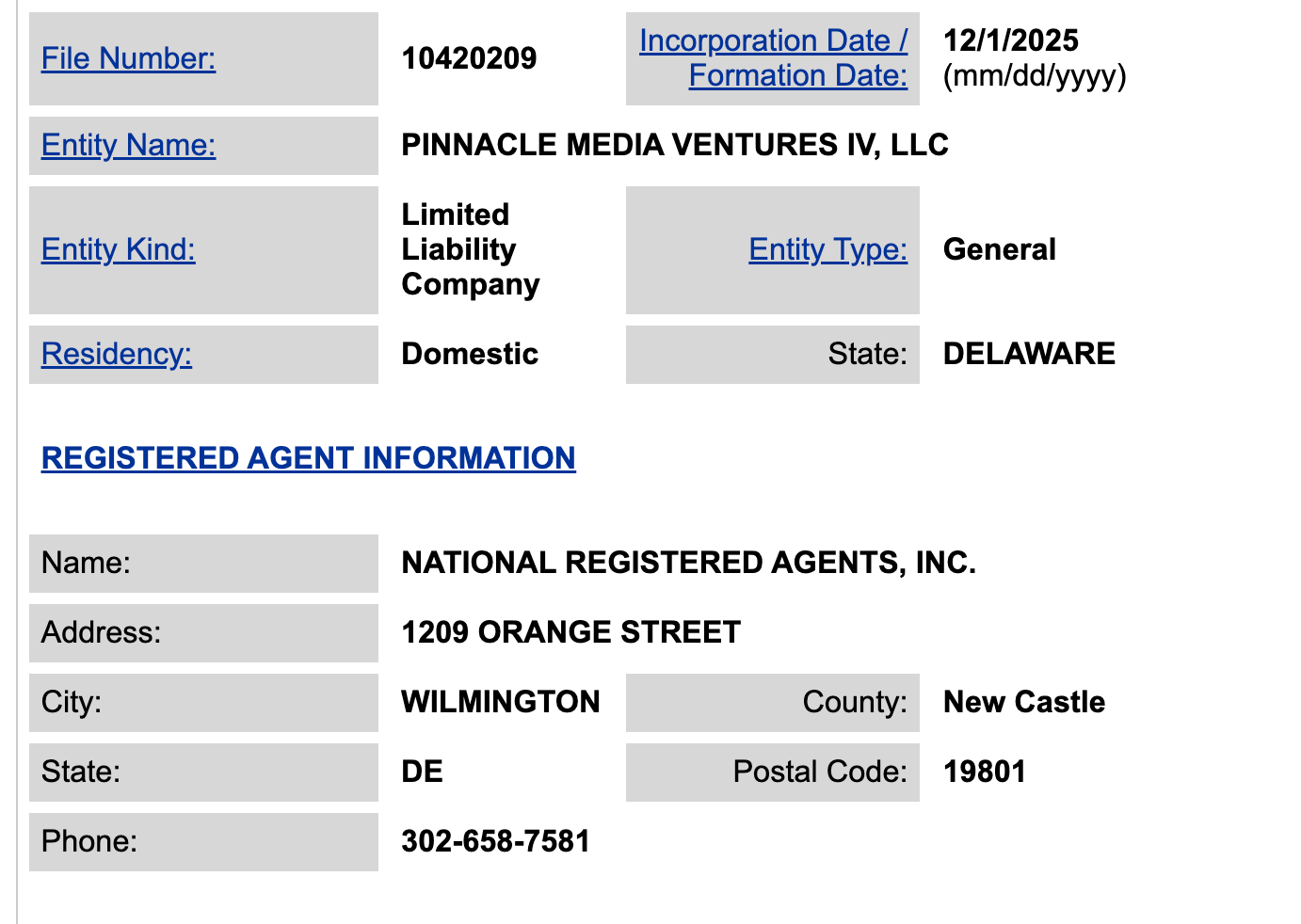 So I figured: if the Ellisons were planning to acquire Warner Bros., they’d probably use the same structure. These people aren’t exactly creative with naming conventions. I pulled up the Delaware corporate database, typed in “Pinnacle Media Ventures,” and sorted by filing date.