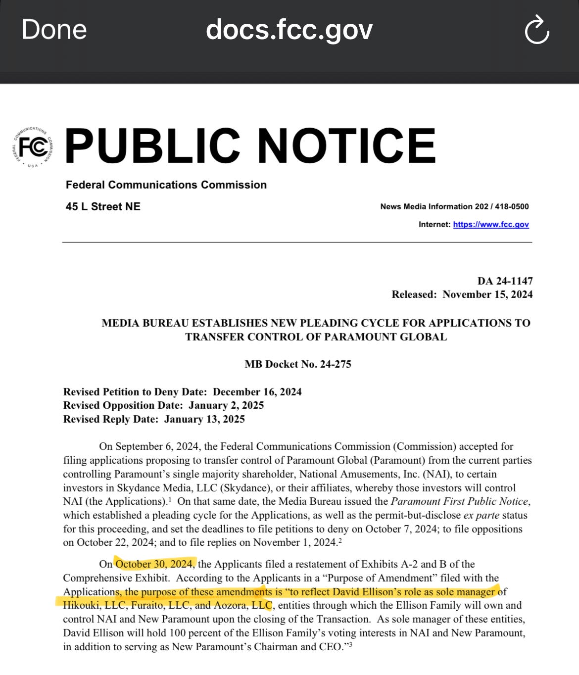 October 29, 2024: Paramount’s merger paperwork was refiled with the FCC. Up until that point, Larry Ellison’s name was everywhere; through three different Pinnacle Media shell entities, he controlled 77.5 percent of the stake. Then, in this refiling, everything shifted. David Ellison was suddenly listed as having 100 percent of the voting rights. Larry stayed the financier, still supplying three-quarters of the cash, but now he was described only as a “backer” rather than a controller. The money never left. What disappeared was Larry’s direct accountability.
