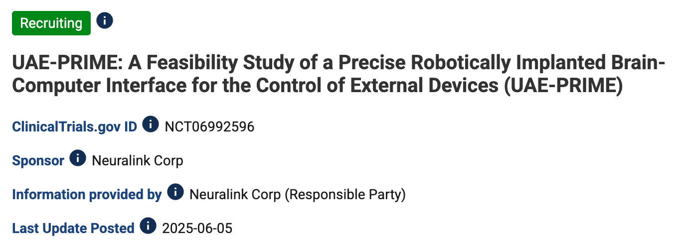 May 13, 2025: Five days later, Neuralink announces they’re opening a clinical trial site at Cleveland Clinic Abu Dhabi. First international trial location. The announcement is sparse on details but confirms the site will be operational soon.