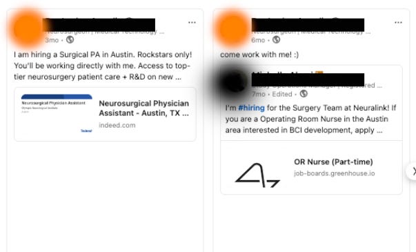 Indeed - Neuralink job postings (OR Specialist, Neurosurgeon Resident): https://www.indeed.com/cmp/Neuralink/jobs